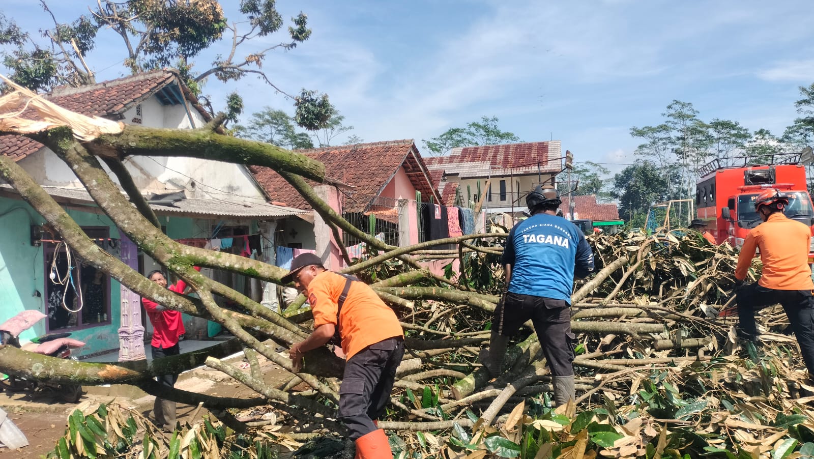 Sejak Sabtu (11/4) pagi, petugas gabungan dari BPBD, Tagana, TNI, dan Polri bersama warga bahu-membahu memperbaiki bangunan yang rusak. Mereka juga mengevakuasi ratusan pohon duren yang tumbang hingga sempat menutup akses jalan umum. Meskipun proses pembersihan memakan waktu, semangat gotong royong terus berlanjut demi mempercepat pemulihan kondisi lingkungan.