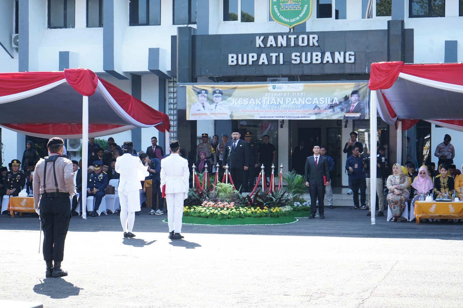 Subang – Bupati Subang, Reynaldy Putra Andita BR, S.IP, didampingi Wakil Bupati Subang, H. Agus Masykur Rosyadi, S.Si., MM, memimpin Upacara Peringatan Hari Kesaktian Pancasila Tingkat Kabupaten Subang Tahun 2025. Upacara berlangsung di Halaman Kantor Bupati Subang pada Rabu (1/10/2025).