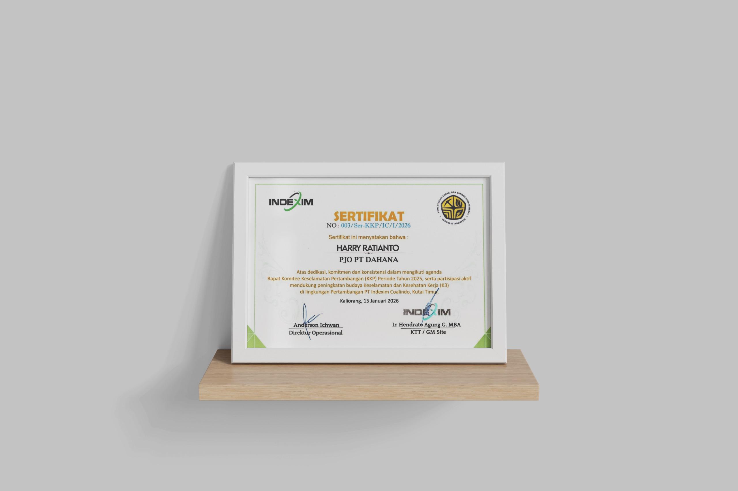 Kabar membanggakan datang dari site project PT Dahana di Kaliorang, Kutai Timur. Penanggung Jawab Operasional (PJO) Dahana Site Indexim Coalindo, Harry Ratianto, sukses menyabet sertifikat apresiasi Komite Keselamatan Pertambangan (KKP) Tahun 2025 dari PT Indexim Coalindo, Kamis (15/01/2026).