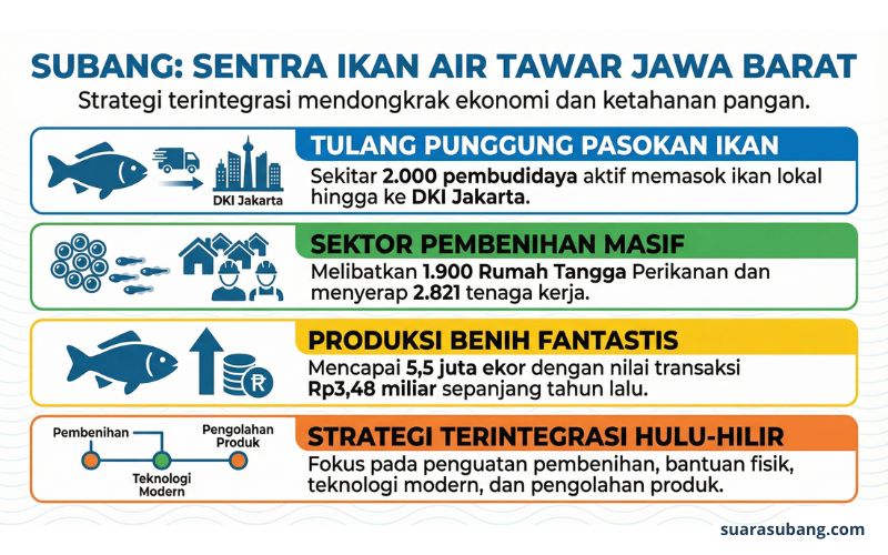 Potensi besar perikanan air tawar di Kabupaten Subang terus dimaksimalkan oleh pemerintah daerah. Hingga awal tahun 2026, Dinas Perikanan Kabupaten Subang mencatat sekitar 2.000 pembudidaya aktif, mulai dari skala kecil hingga menengah, telah menjadi tulang punggung pasokan ikan lokal hingga ke DKI Jakarta.