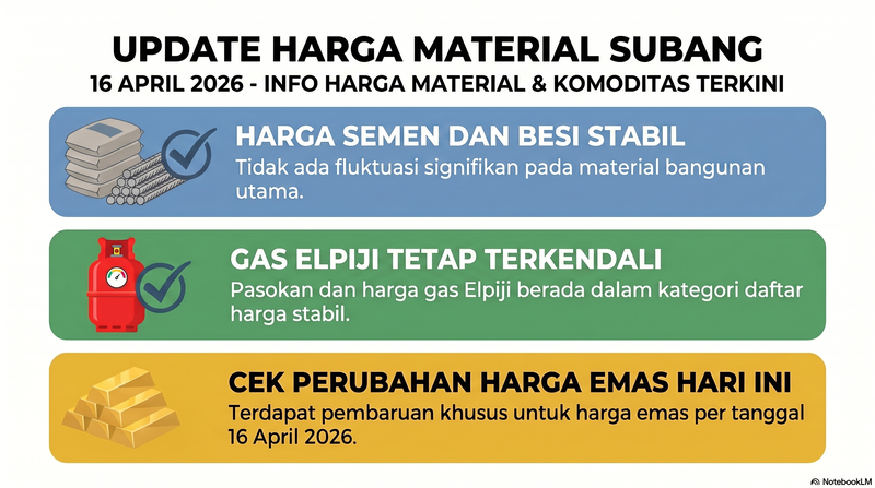 Meta Description: Simak update harga material Subang per 16 April 2026. DKUPP rilis daftar harga stabil untuk semen, besi, gas Elpiji, hingga update harga emas hari ini.