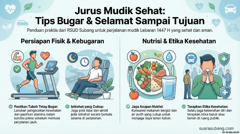 Jurus Mudik Sehat merupakan panduan khusus dari RSUD Subang untuk memastikan pemudik tetap bugar selama perjalanan Hari Raya Idulfitri 1447 H. Persiapan kesehatan menjadi kunci utama agar perjalanan jauh tidak menjadi beban fisik yang berisiko bagi keselamatan berkendara. Oleh karena itu, manajemen RSUD Subang mengimbau para “Mitra Sehati” untuk memperhatikan tujuh poin penting demi kenyamanan bersama.