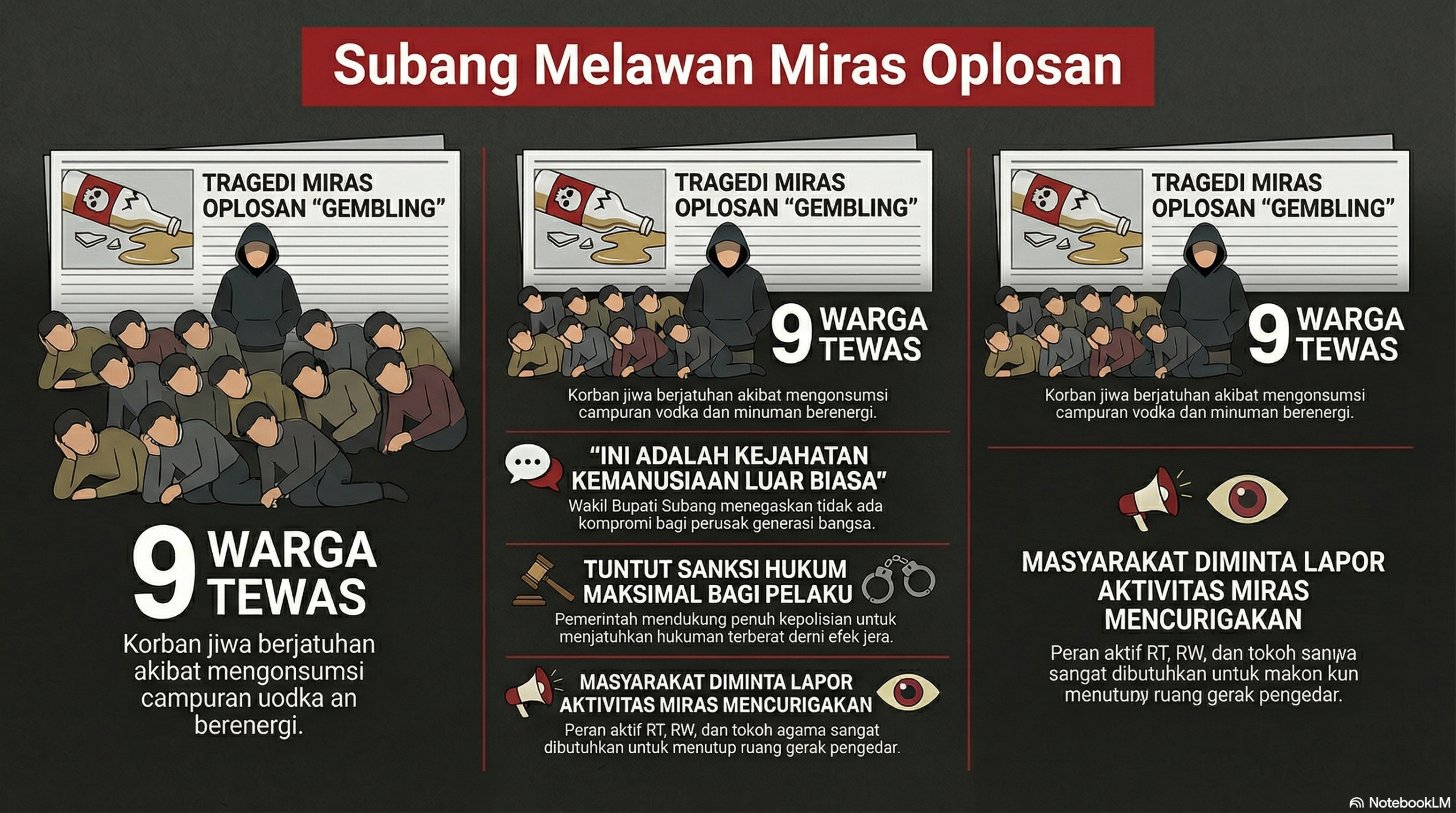 Wakil Bupati Subang, Agus Masykur Rosyadi, mengeluarkan peringatan keras terhadap para pengedar minuman keras (miras) oplosan. Ia menegaskan pemerintah daerah tidak akan memberi toleransi sedikit pun bagi pihak yang merusak masa depan generasi muda.