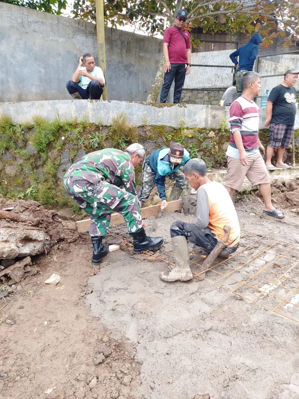 Sertu Hermawan, Babinsa Desa Curugrendeng, terjun langsung membaur bersama warga untuk mengerjakan konstruksi saluran air. Kehadirannya tidak hanya memberikan bantuan fisik, tetapi juga memotivasi warga agar pekerjaan tersebut cepat rampung.